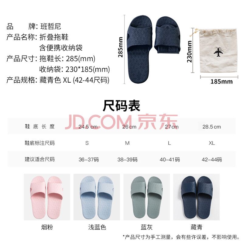 商品相册:班哲尼 旅行便携式折叠酒店居家EVA防滑浴室情侣洗澡非一次性拖鞋 含便携收纳袋 藏青 XL(42-44尺码)第