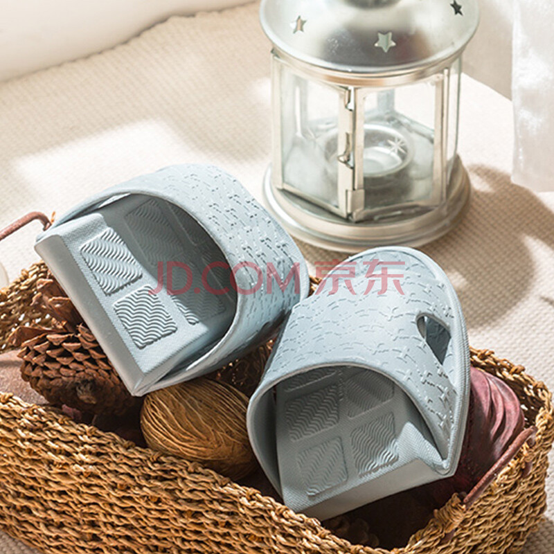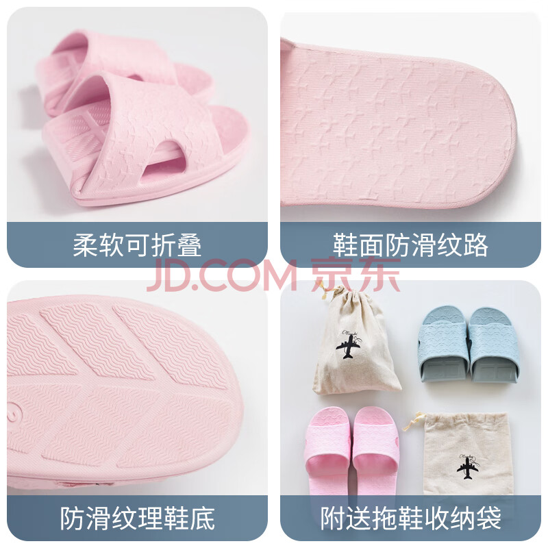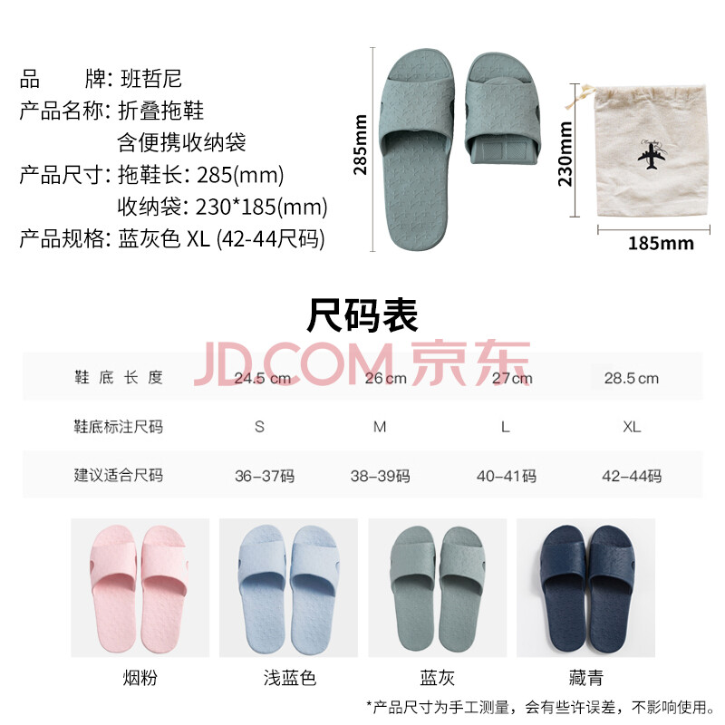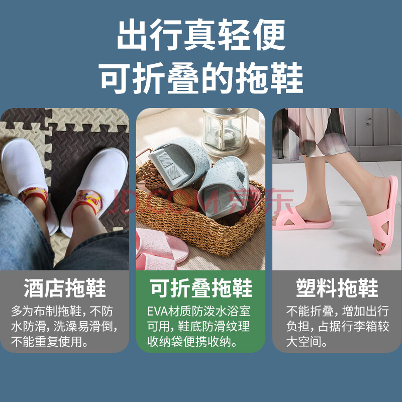 商品相册:班哲尼 旅行便携式折叠酒店居家EVA防滑浴室情侣洗澡非一次性拖鞋 含便携收纳袋 蓝灰 XL(42-44尺码)第