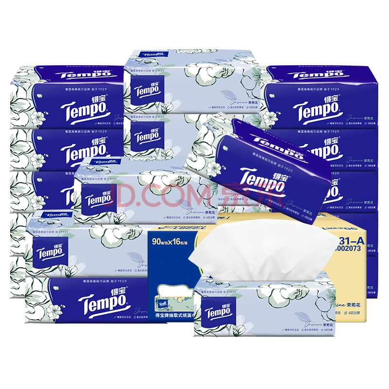商品相册:得宝(TEMPO)一博同款 抽纸 真M码 茉莉花味4层90抽*16包 湿水不易破 纸巾第