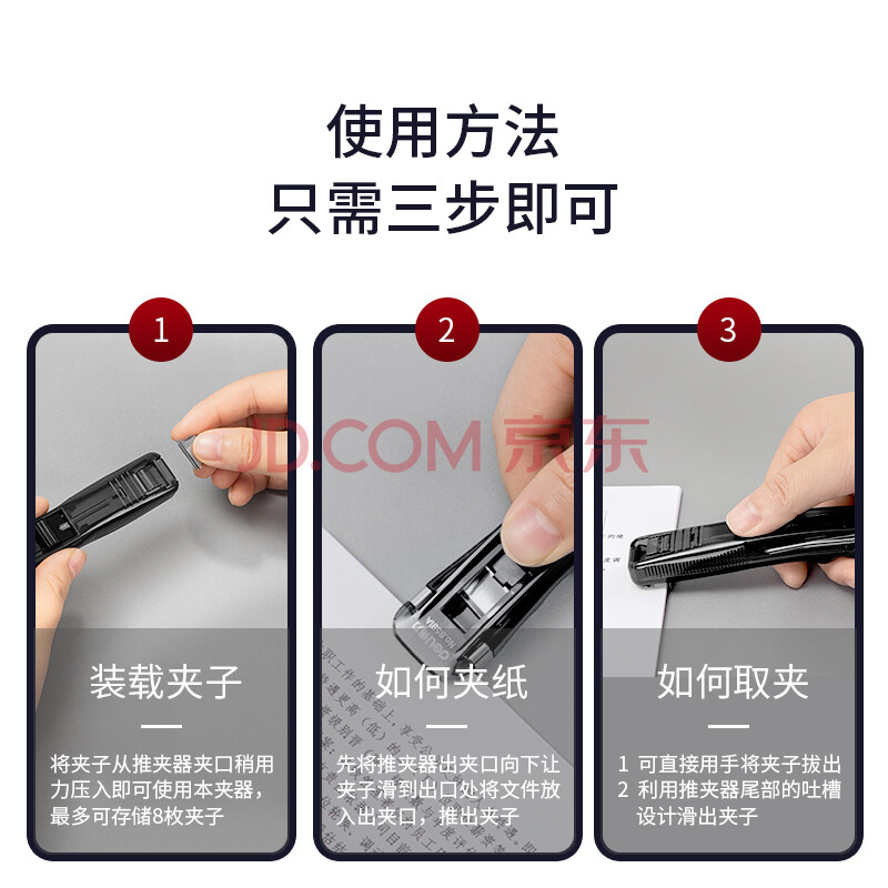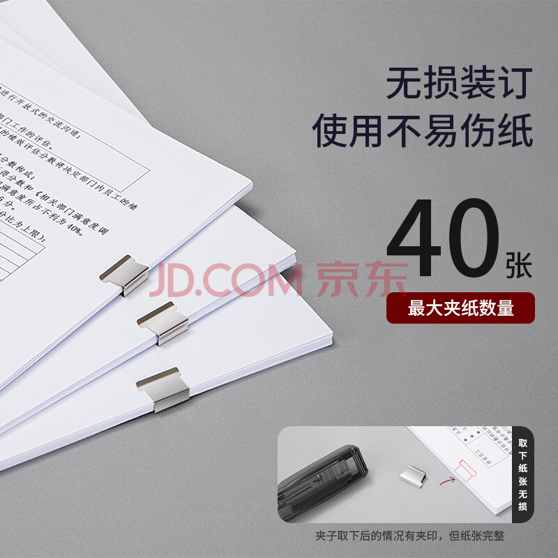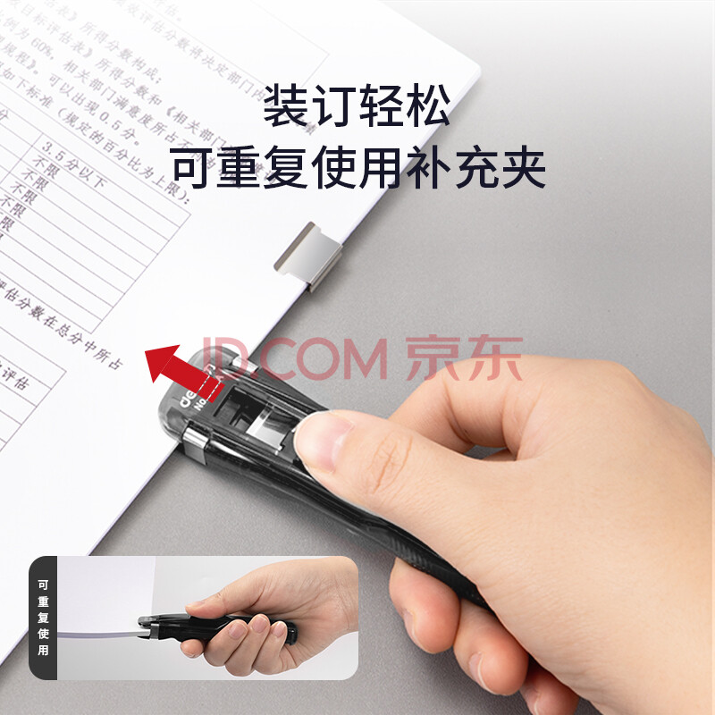 商品相册:得力(deli)【超级爆款】办公装订推夹器套装(推夹器 60枚补充夹) 可夹纸张数40张文件 透明黑33183第