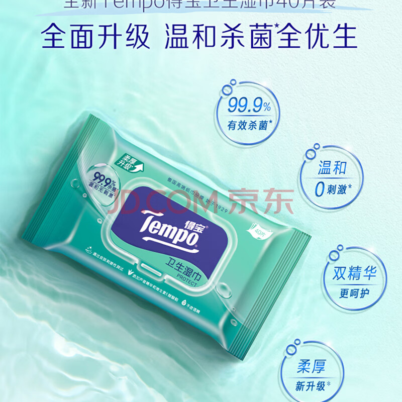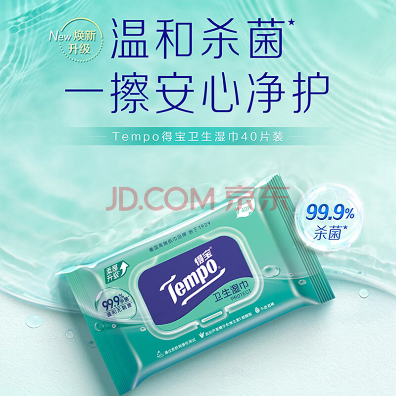 商品相册:得宝(TEMPO)杀菌湿巾 40片*1包 抽取式 温和不刺激 杀菌率99.9% 湿纸巾第