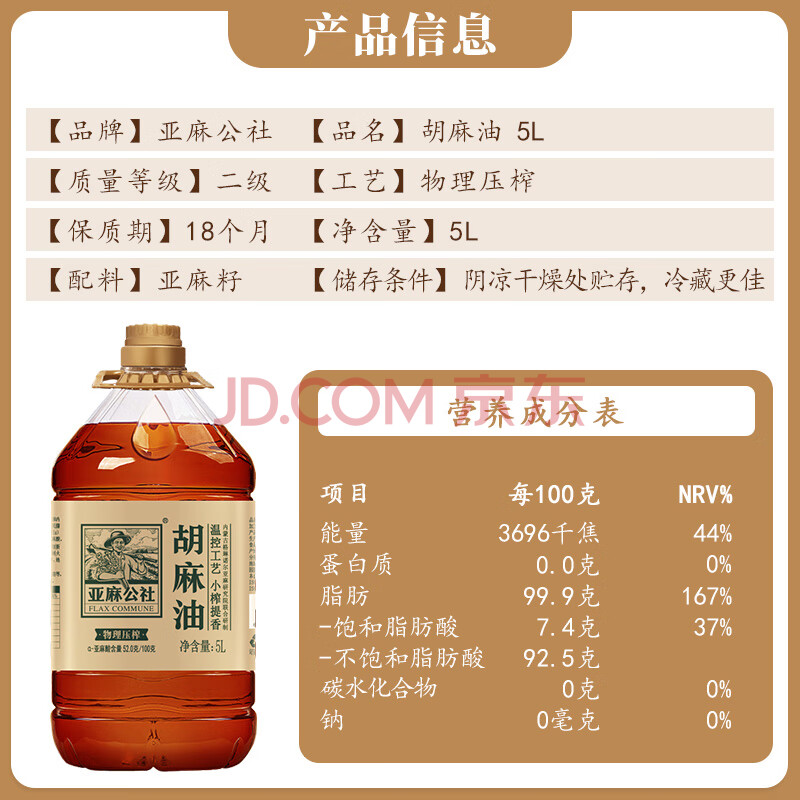 商品相册:亚麻公社胡麻油5L 保真亚麻籽油小榨醇香炒菜食用油 节日礼品员工福利第1张/共9