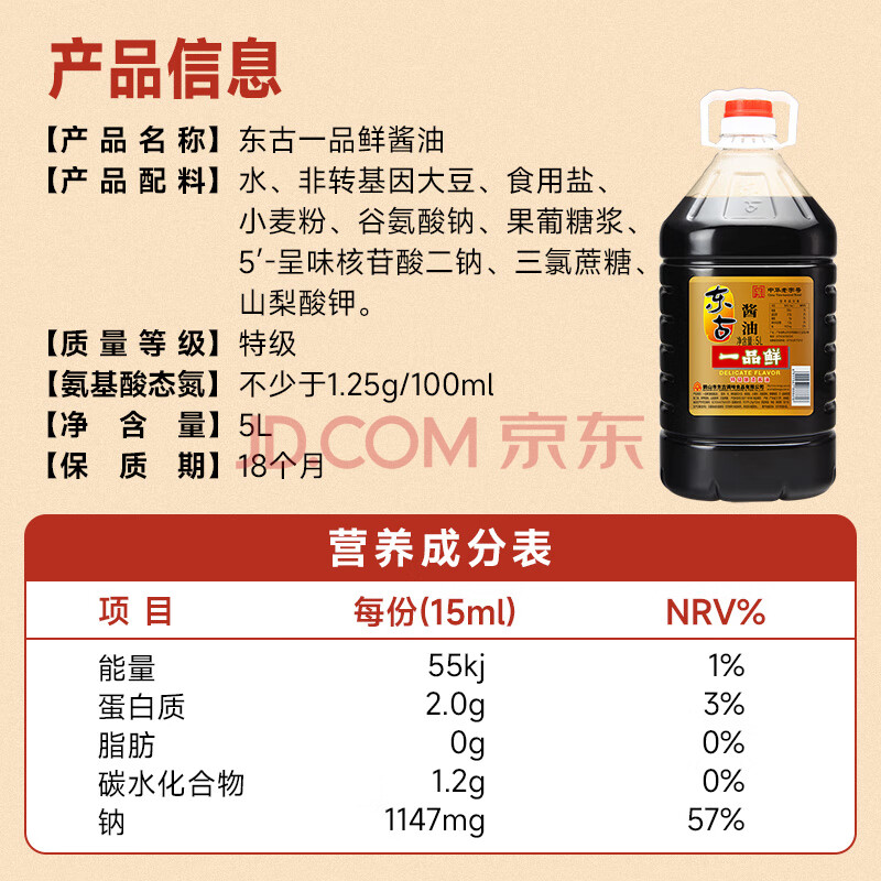 商品相册:东古 一品鲜酱油【特级生抽】5L 酿造酱油量贩餐饮大包装第