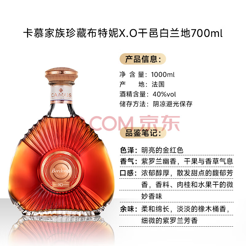 商品相册:卡慕(CAMUS) 家族珍藏布特妮XO 单一庄园 干邑白兰地洋酒700ml 进口洋酒第