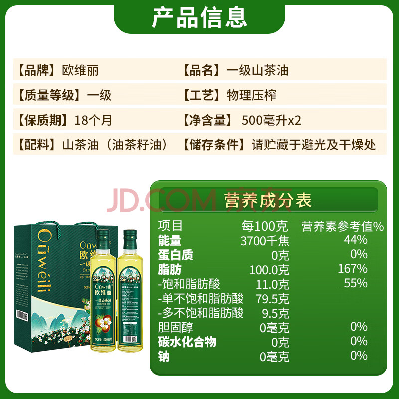 商品相册:欧维丽(Ouweili)欧维丽保真山茶油500ml*2礼盒 原香纯正茶籽油食用油 团购礼盒第