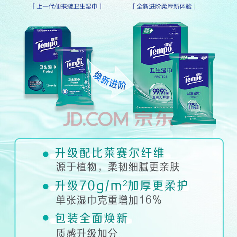 商品相册:得宝(TEMPO)杀菌湿巾盒装 12片*5包 杀菌率99.9% 温和不刺激 湿纸巾第
