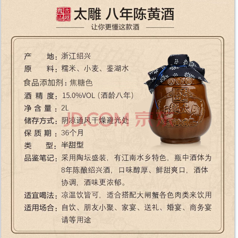 商品相册:古越龙山太雕八年 半甜型 绍兴黄酒 2L 单坛装第