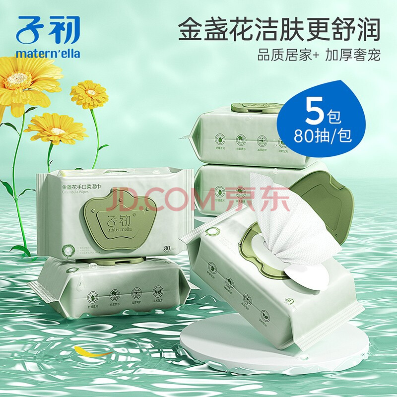 商品相册:子初金盏花手口柔湿巾80抽*5包加厚款湿纸巾加大家庭日常清洁湿巾第