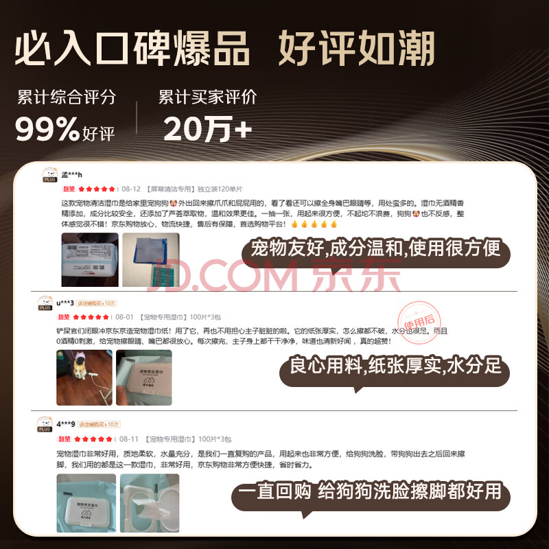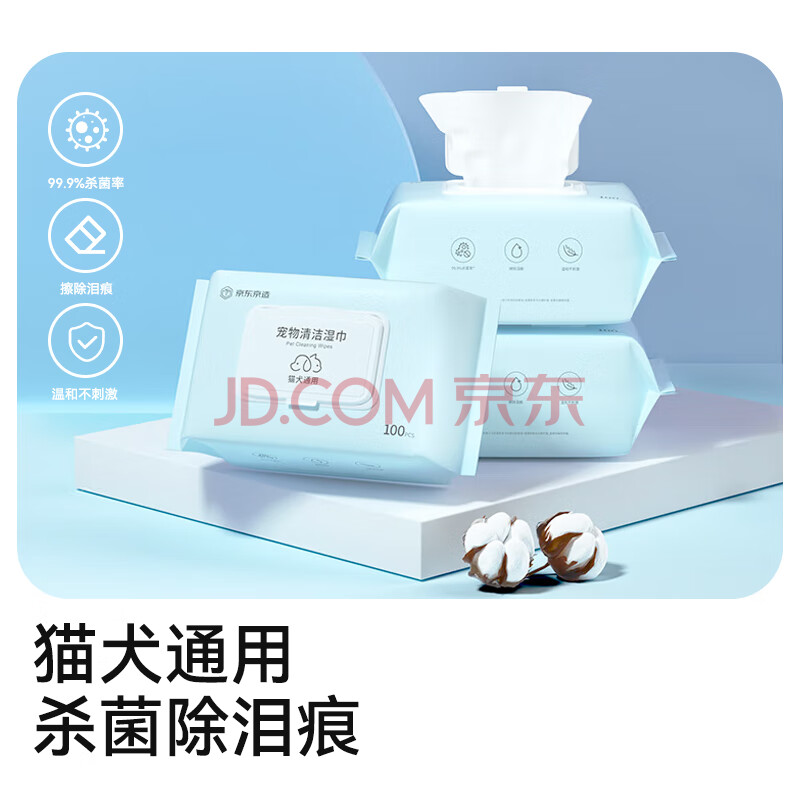 商品相册:京东京造 宠物湿巾100片*3包 猫狗通用可擦泪痕 99.9%杀菌率湿纸巾第