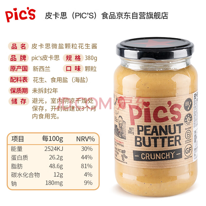 商品相册:皮卡思pics花生酱 有盐颗粒380g 新西兰原装进口火锅蘸料抹面包酱拌面酱第