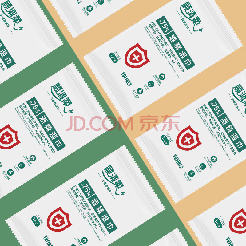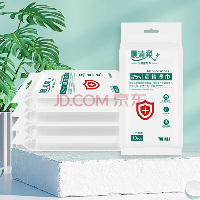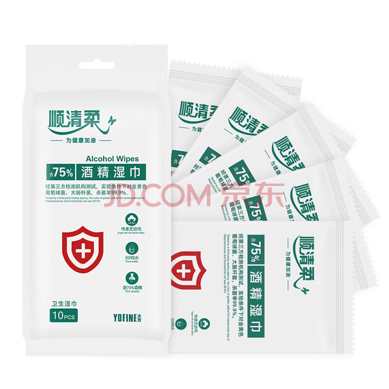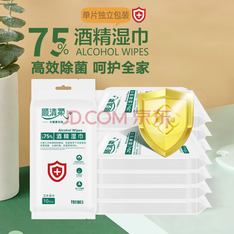商品相册:顺清柔湿巾10片*10包 75%酒精单片独立包装便携清洁湿纸巾无香提装第