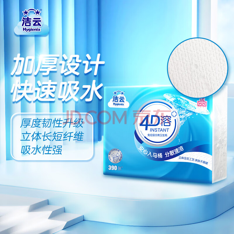 商品相册:洁云卫生纸 4D溶+平板纸390张*3包 大规格 速溶厕纸水溶性压花卫生纸 第