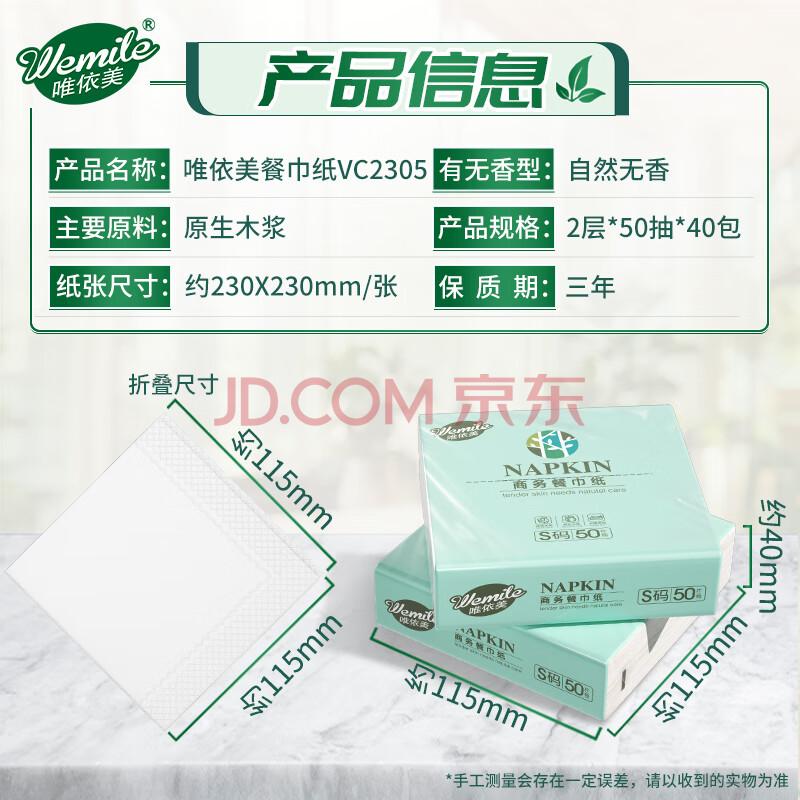 商品相册:唯依美餐巾纸2层50片*40包方巾纸230*230酒店餐厅抽纸巾整箱 VC2305第
