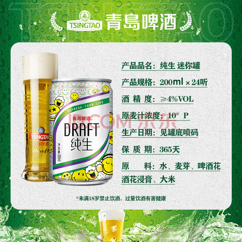 商品相册:青岛啤酒(TsingTao)纯生啤酒 原麦汁浓度10°P 200ml*24听 整箱批发24瓶踏春送礼第