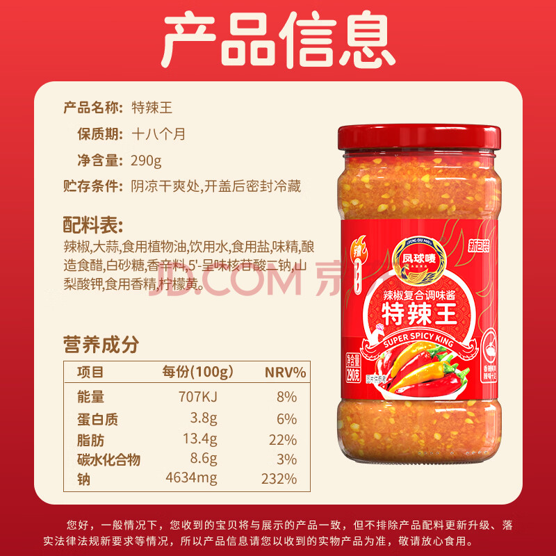 商品相册:凤球唛特辣王辣椒酱290g蒜蓉辣椒酱火锅调料蘸料下饭拌面拌饭香辣酱第
