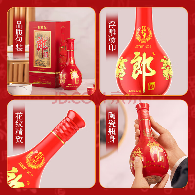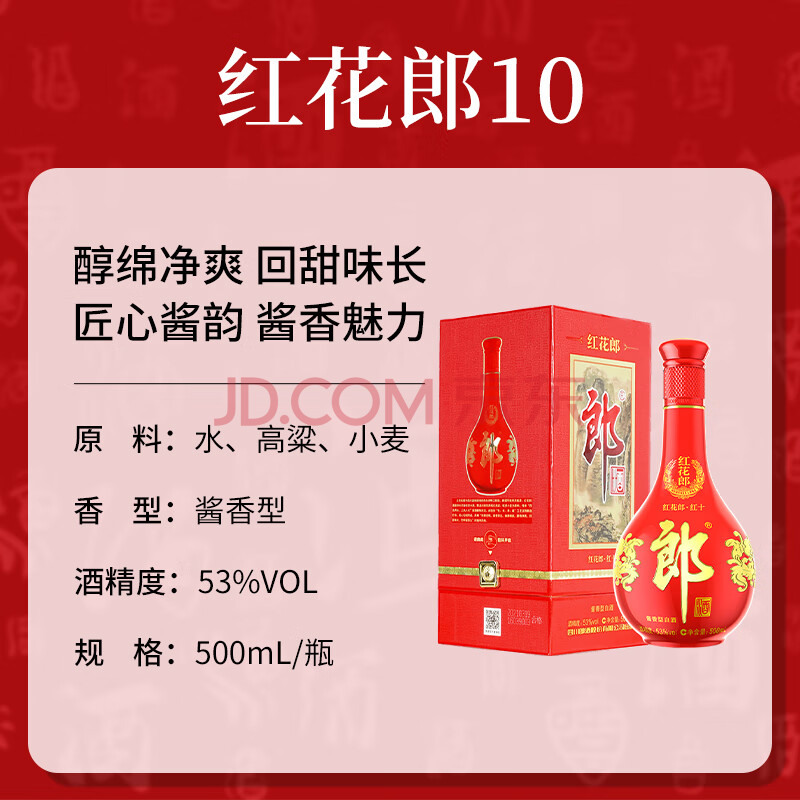 商品相册:郎酒 红花郎10 酱香型白酒 53度 500mL*2瓶 双瓶装 (年份包装随机)第