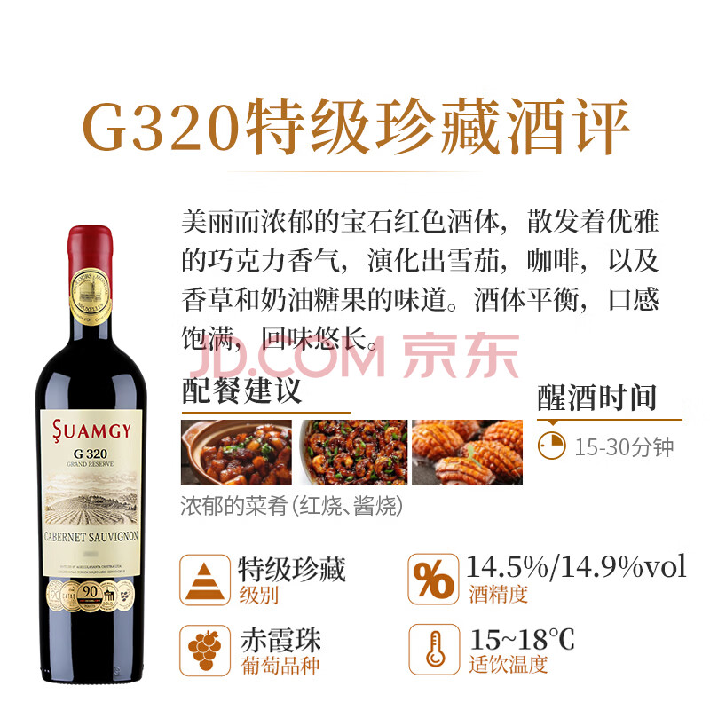 商品相册:圣芝(suamgy)G320特级珍藏赤霞珠干红葡萄酒750ml*6支整箱礼盒装 原瓶进口红酒第