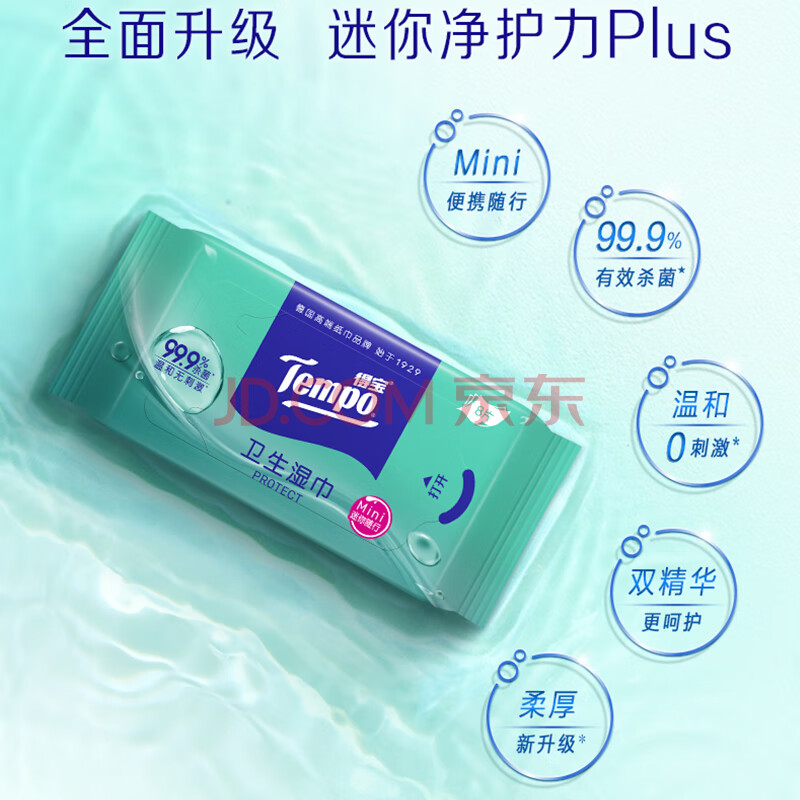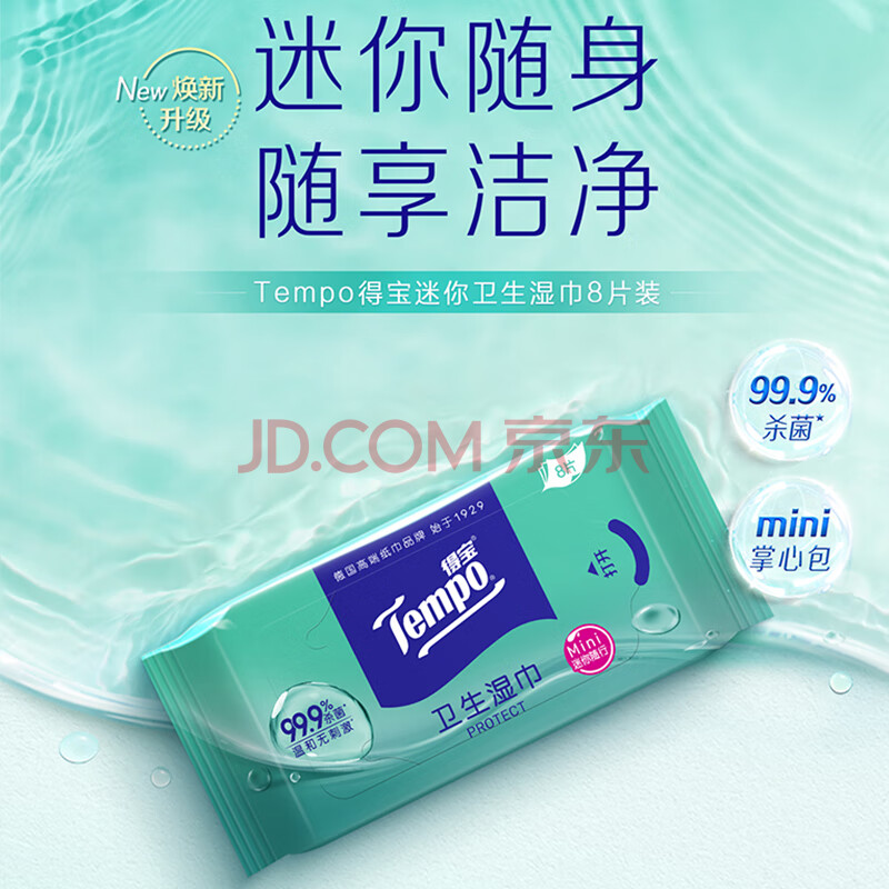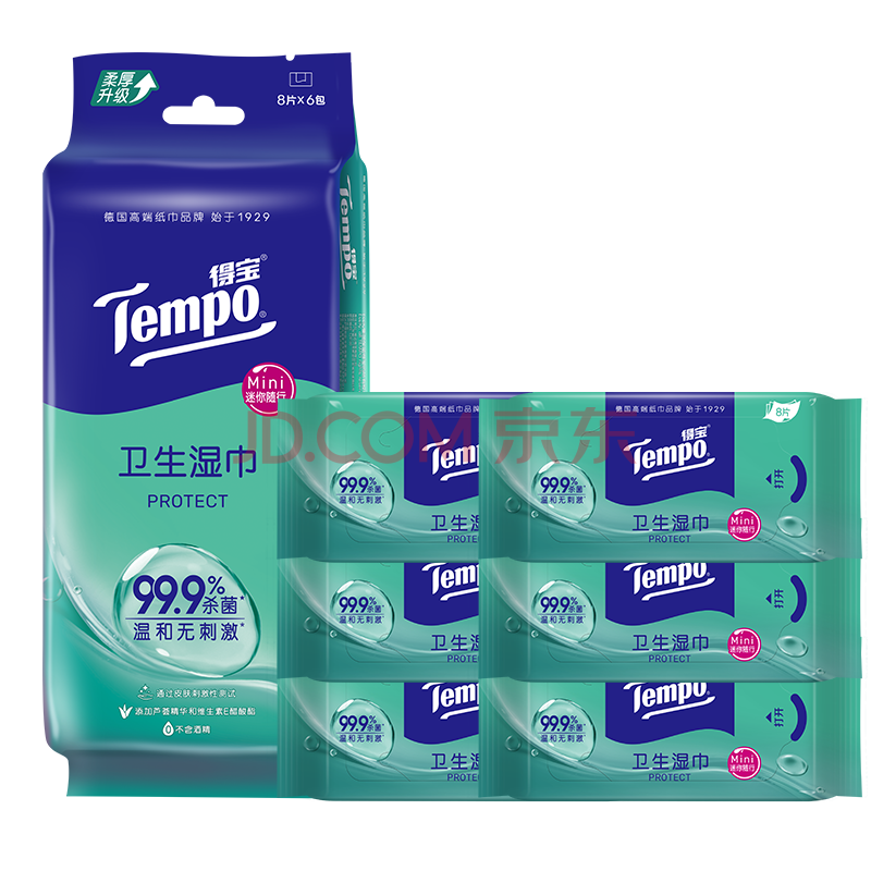 商品相册:得宝(TEMPO)杀菌湿巾 8片*6包 迷你湿巾 杀菌率99.9% 温和不刺激 湿巾小包第