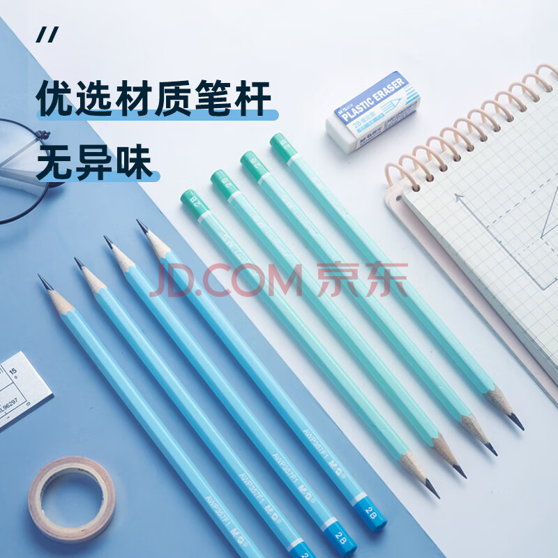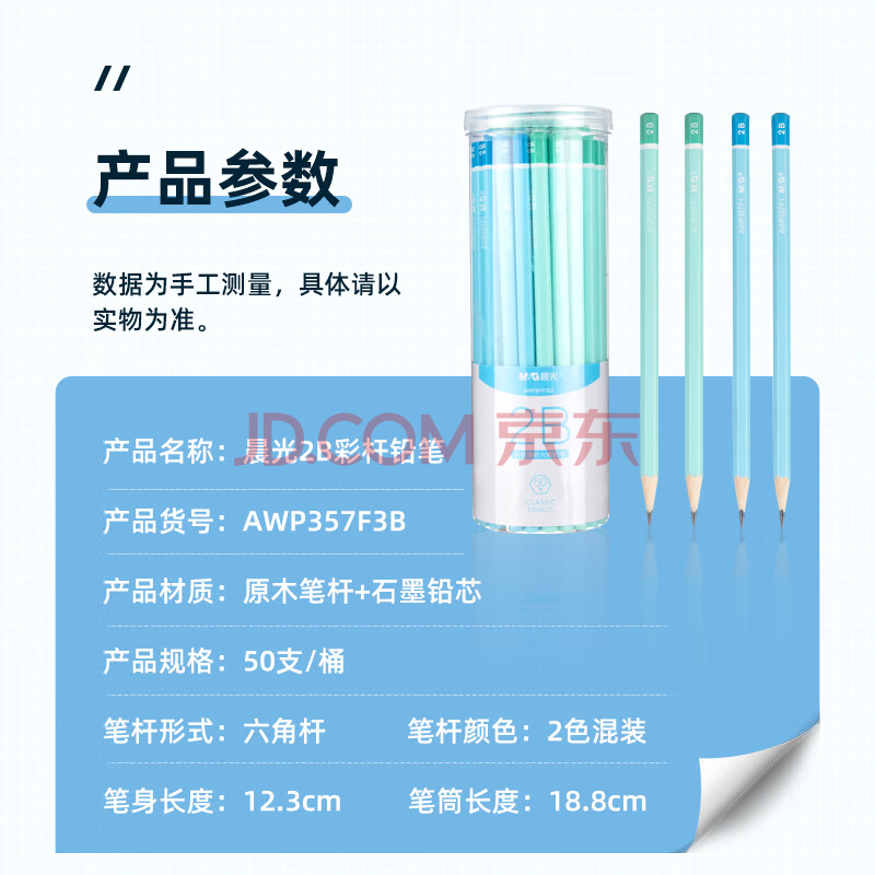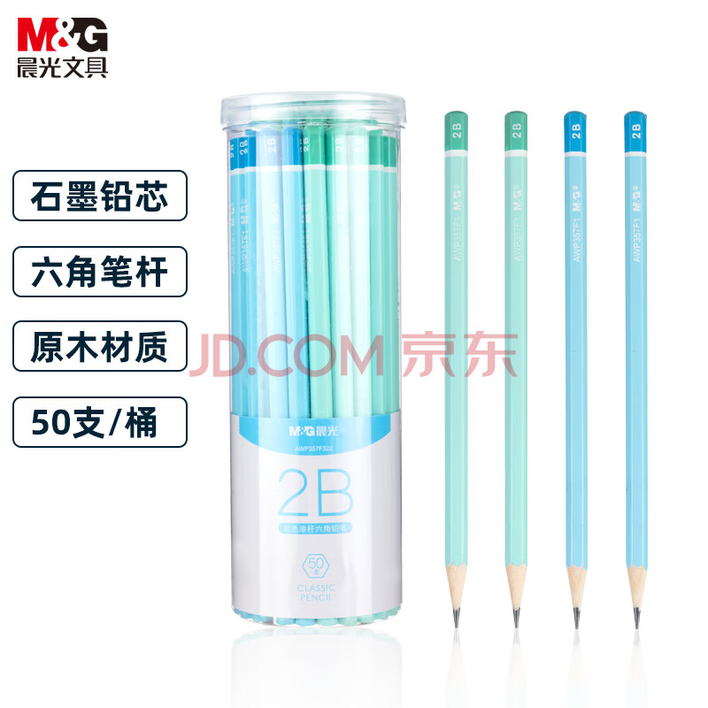 商品相册:晨光(M&G)(M&G)文具2B铅笔彩杆50支 六角木杆铅笔 学生开学涂卡书写美术素描绘图木质铅笔 蓝绿色AWP357F3B第