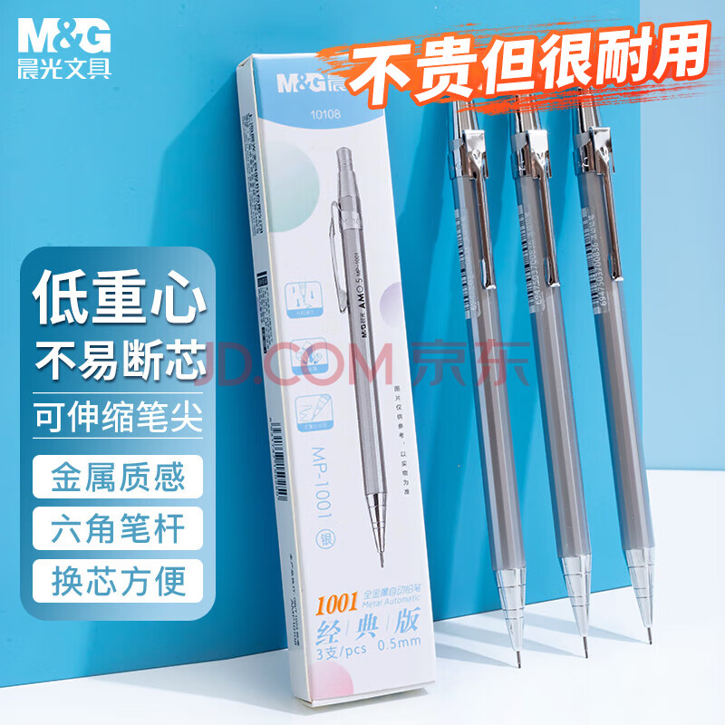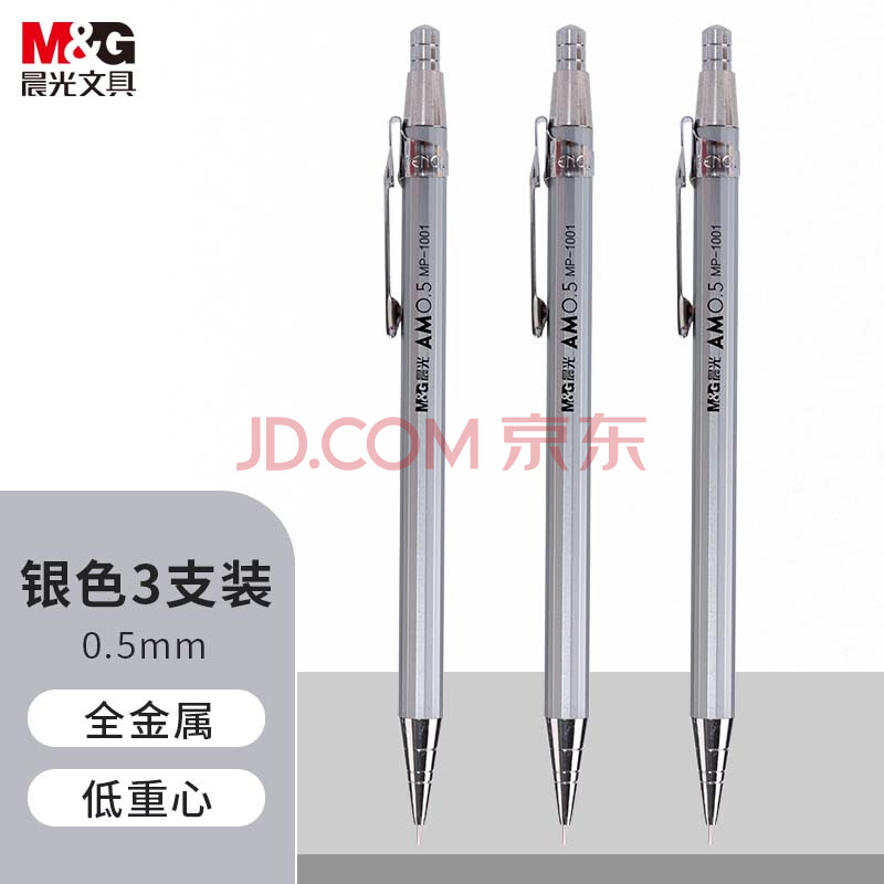 商品相册:晨光(M&G)(M&G)文具自动铅笔0.5mm金属活动铅笔套装银色 学生开学绘图 低重心防断芯 三支装1001I开学必备第