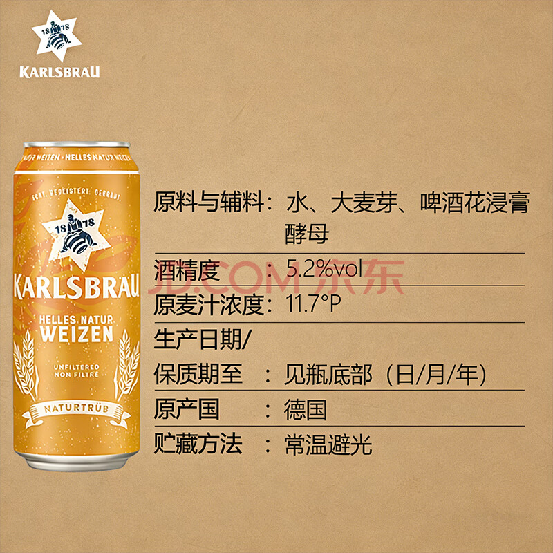 商品相册:卡斯布鲁(KARLSBRAU)小麦啤酒500ml*24听 精酿整箱装 德国进口 京东自营 春日聚会畅饮第