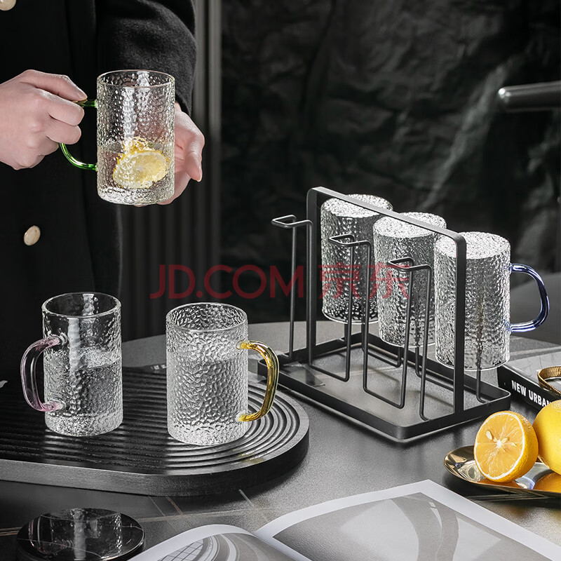 商品相册:格娜斯 日式锤纹玻璃杯带把手水杯套装家用客厅待客茶杯家庭喝水杯子第