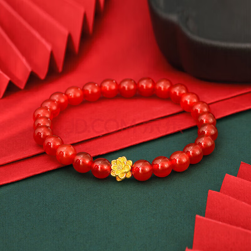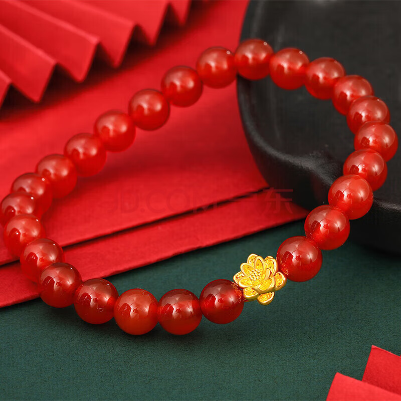 商品相册:梦金园黄金转运珠足金莲花3D硬金路路通手链红玛瑙手串第