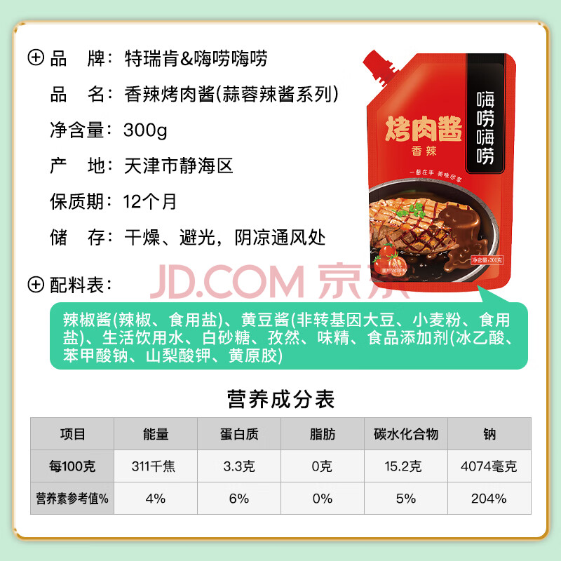 商品相册:特瑞肯(TRICON)香辣烤肉酱烤肉串烧烤腌肉蘸拌饭酱拌煎炒面调味品300g送礼第