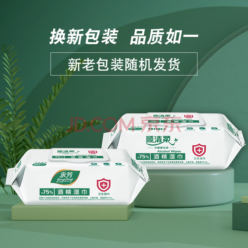 商品相册:顺清柔湿巾80片*4包 75%酒精清抽取式一次性清洁湿纸巾无香整箱销售第