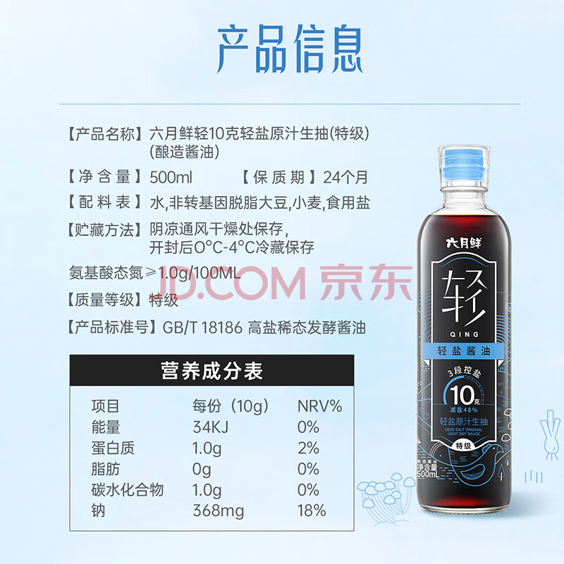 商品相册:六月鲜轻系列10克轻盐原汁酱油500ml【减盐 特级酱油】生抽调味欣和出品第