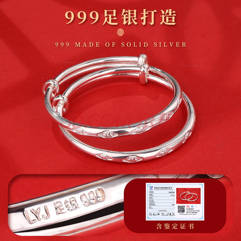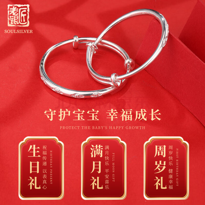 商品相册:老银匠999足银手镯五福宝宝银手镯男女儿童银镯子送宝宝满月周岁礼物第