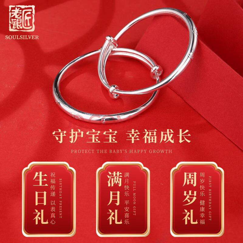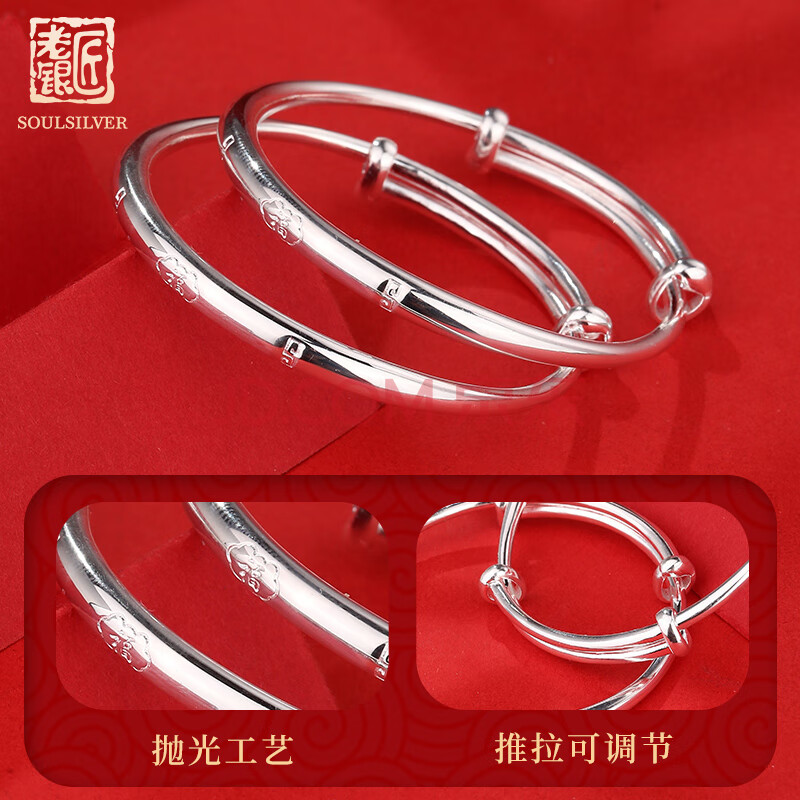 商品相册:老银匠999足银手镯纳福光面实心银镯子银儿童手镯送宝宝满月周岁礼物第