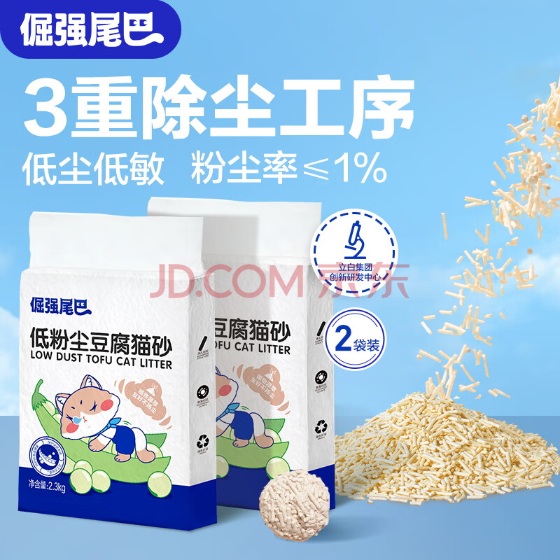 商品相册:倔强尾巴原味100%豆腐猫砂 无尘除臭速吸水高能结团 敏感猫优选4.6斤*2袋第