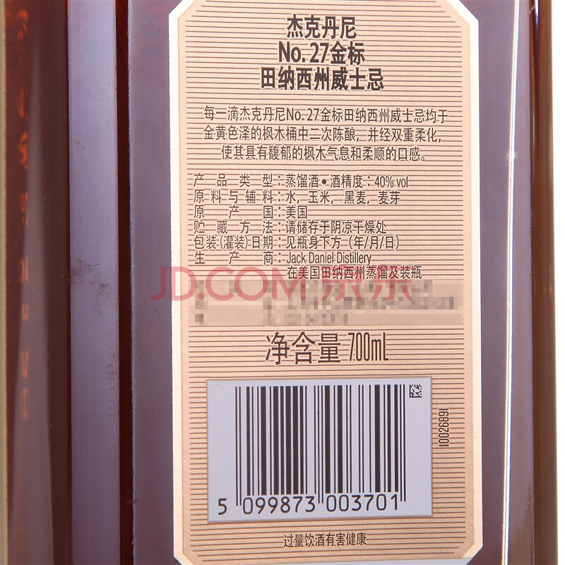 商品相册:杰克丹尼(Jack Daniels)田纳西州 调和型威士忌 洋酒 No.27金标 700ml 节日送礼第