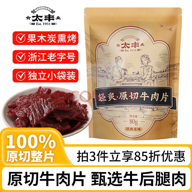 商品相册:太丰轻炙薄切牛肉片原味80g开袋即食办公室健康解馋小零食酱卤牛肉片第