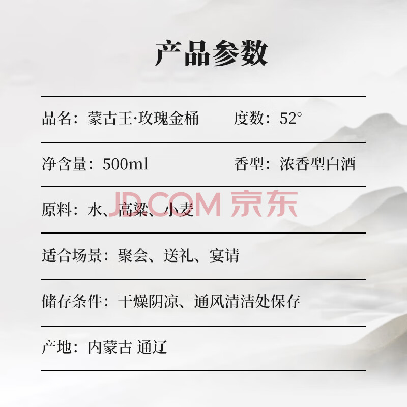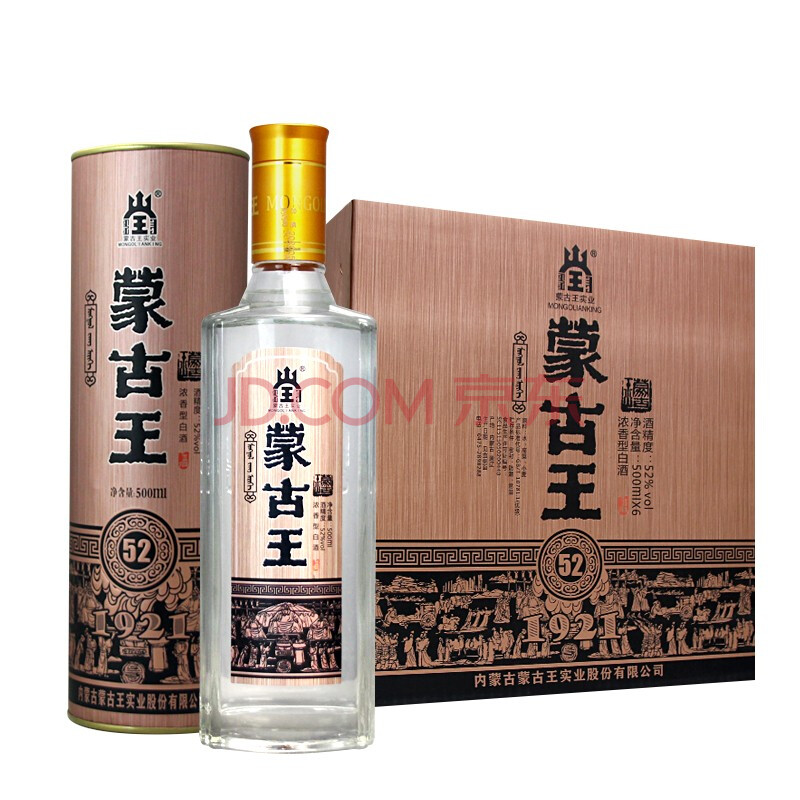 商品相册:蒙古王 白酒 浓香型粮食酒 高度白酒礼盒整箱桶装 52度玫瑰金桶500ml*6第