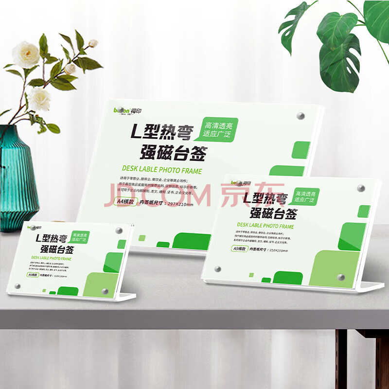 商品相册:得印(befon)L型亚克力桌牌台卡高清透明台签工位牌强磁双面210mm*150mm会议展示牌座牌A5横款立牌8849第