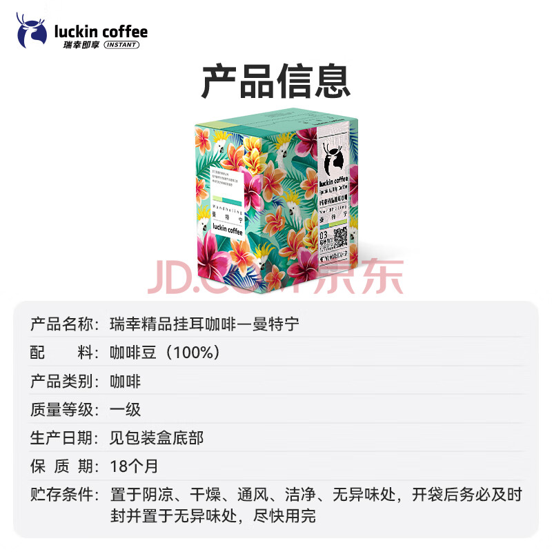 商品相册:瑞幸咖啡精品挂耳咖啡现磨手冲滤泡挂耳黑咖啡 曼特宁 10g*8包/盒第