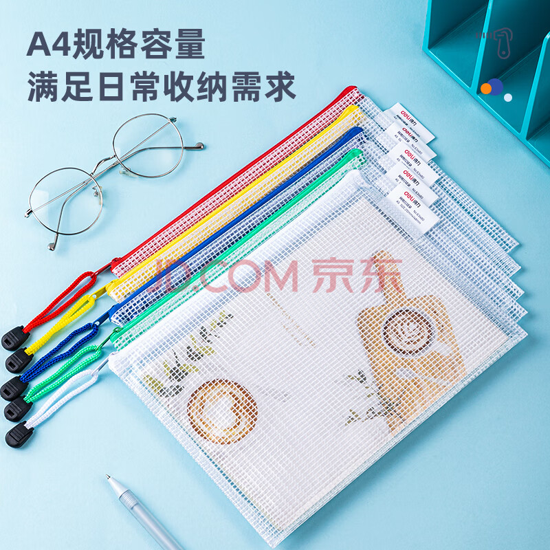 商品相册:得力(deli)63480 A5透明文件袋拉边袋 网格拉链袋防水资料袋档案袋 票据试卷收纳袋 颜色随机 12个/包 1包装第
