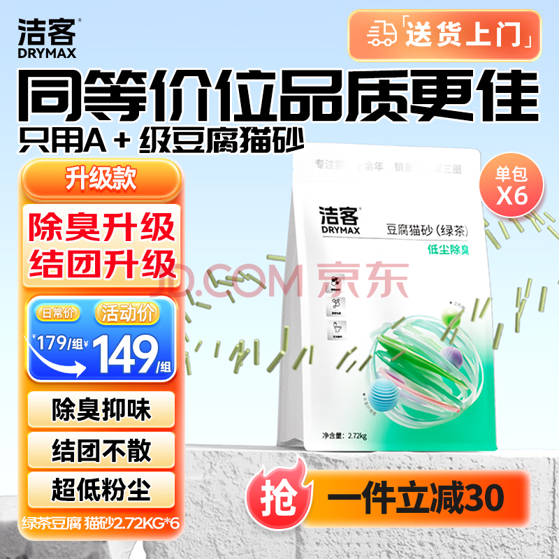 商品相册:洁客(Drymax)豆腐砂植物环保结团除臭猫砂绿茶2.72kg*6包共16.32kg第