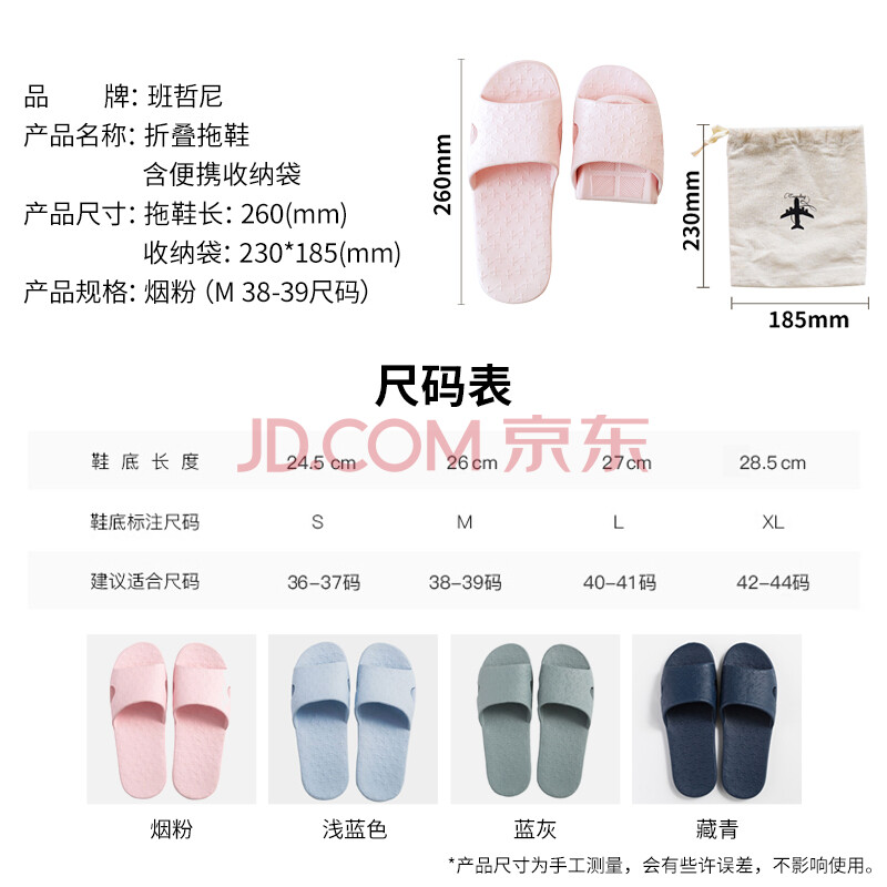 商品相册:班哲尼 旅行便携式折叠酒店居家EVA防滑浴室情侣洗澡非一次性拖鞋 含便携收纳袋 烟粉 M(38-39尺码)第