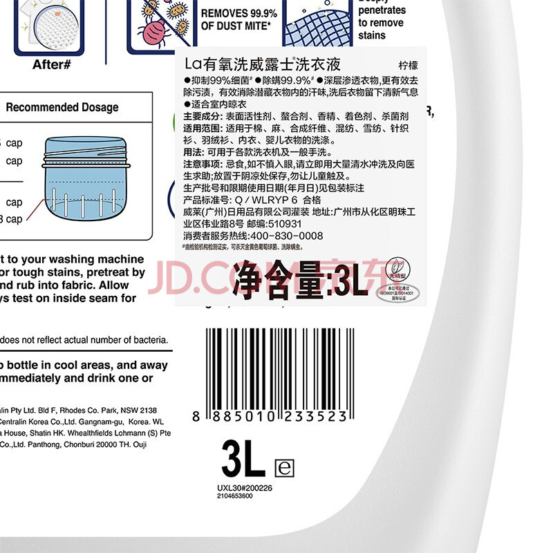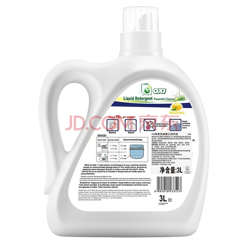 商品相册:威露士 抗菌有氧洗衣液柠檬3L *2瓶装第