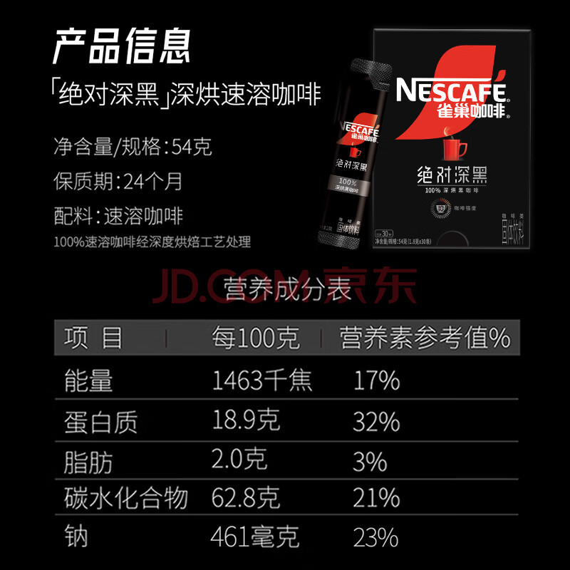 商品相册:雀巢(Nestle)绝对深黑美式速溶黑咖啡0糖0脂*健身燃减深烘1.8g*30包第