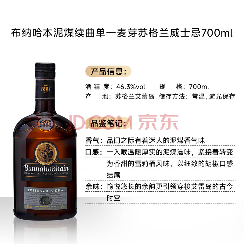 商品相册:布纳哈本(bunnahabhain) 泥煤续曲苏格兰单一麦芽 威士忌 700ML 进口洋酒第
