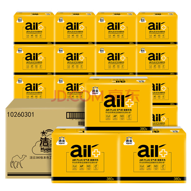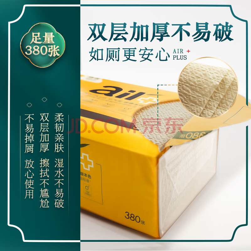 商品相册:洁云卫生纸 本色空气柔380张(2层)*30包 竹浆厕纸平板抽纸 擦手纸巾第