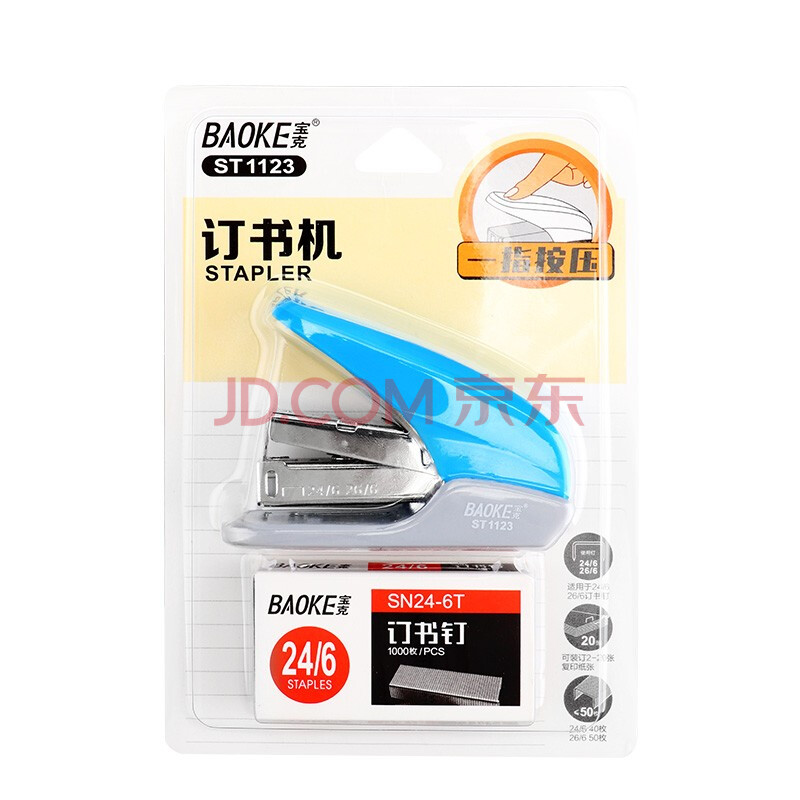 商品相册:宝克(BAOKE)ST1123 省力订书机搭配订书钉 颜色随机 卡装第