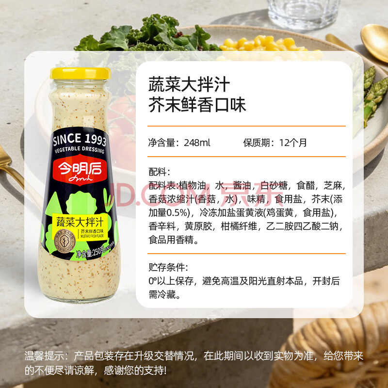 商品相册:今明后 沙拉酱焙煎芝麻沙拉汁蔬菜沙拉大拌汁调味品 芥末鲜香248ml*1瓶第