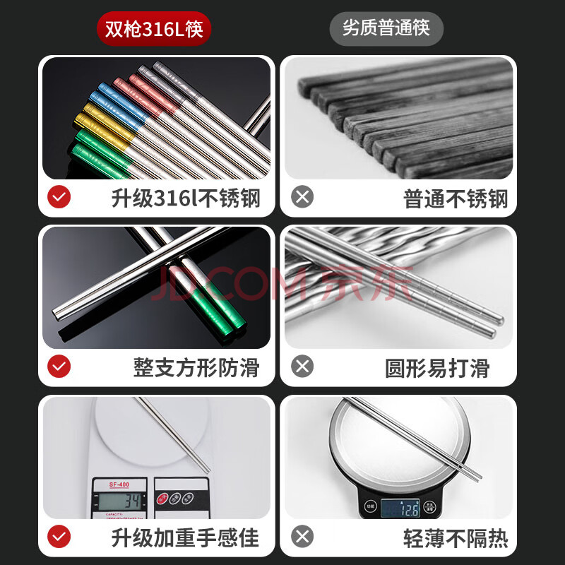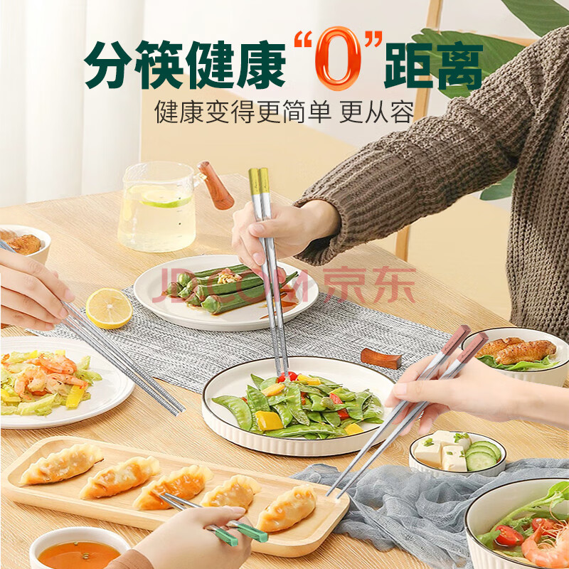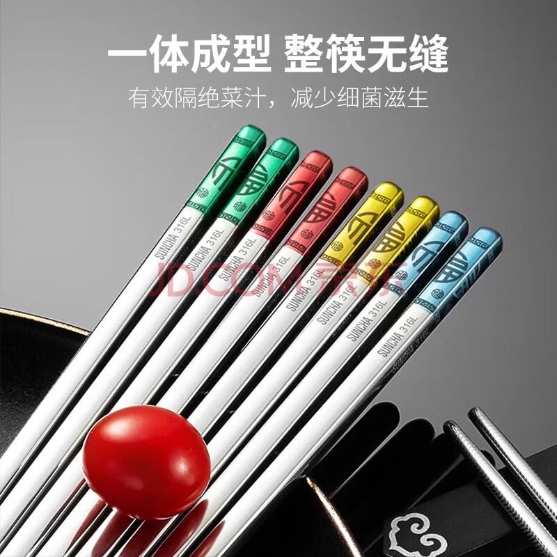 商品相册:双枪 316L不锈钢筷子家用 防滑公筷专筷多色五福临门筷餐具套装5双装第