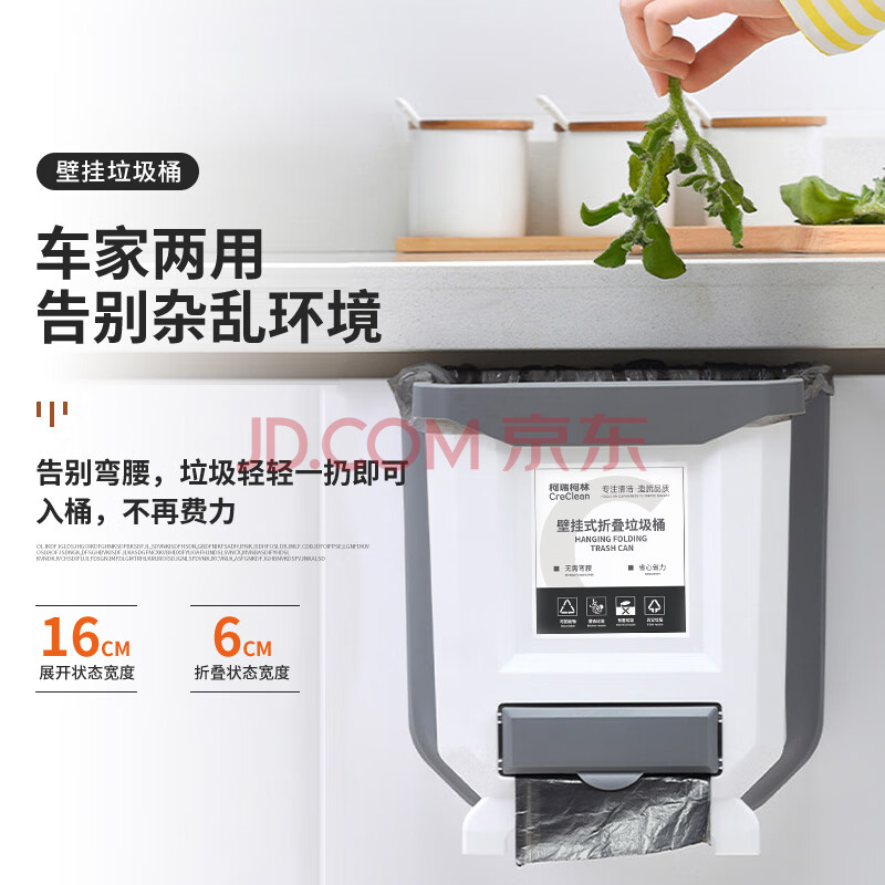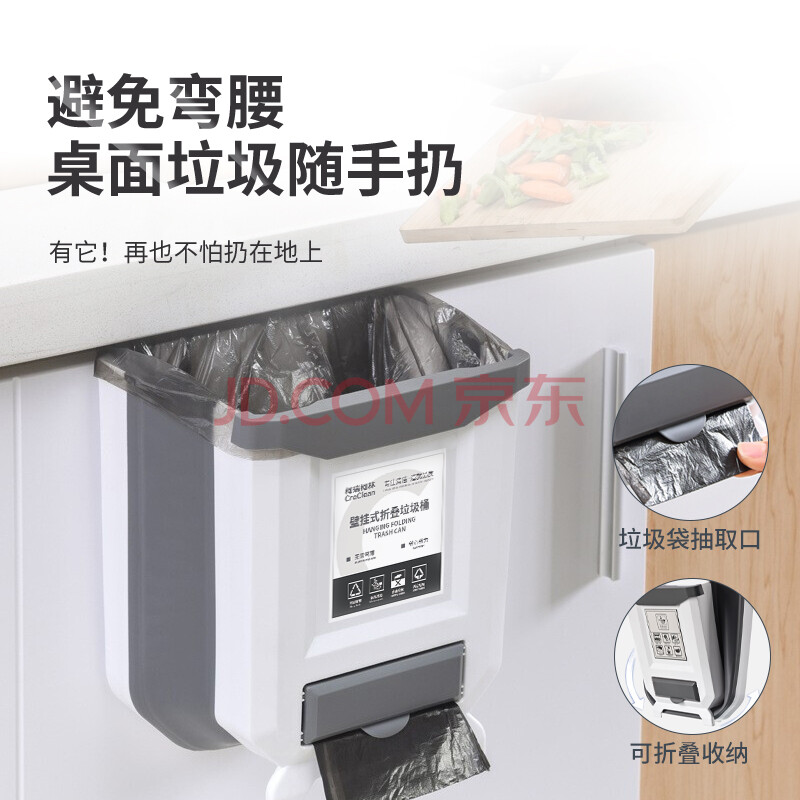 商品相册:柯瑞柯林(CreClean)壁挂垃圾桶厨房 可折叠家用车用收纳桶拉圾篓 TC002W 1个装第