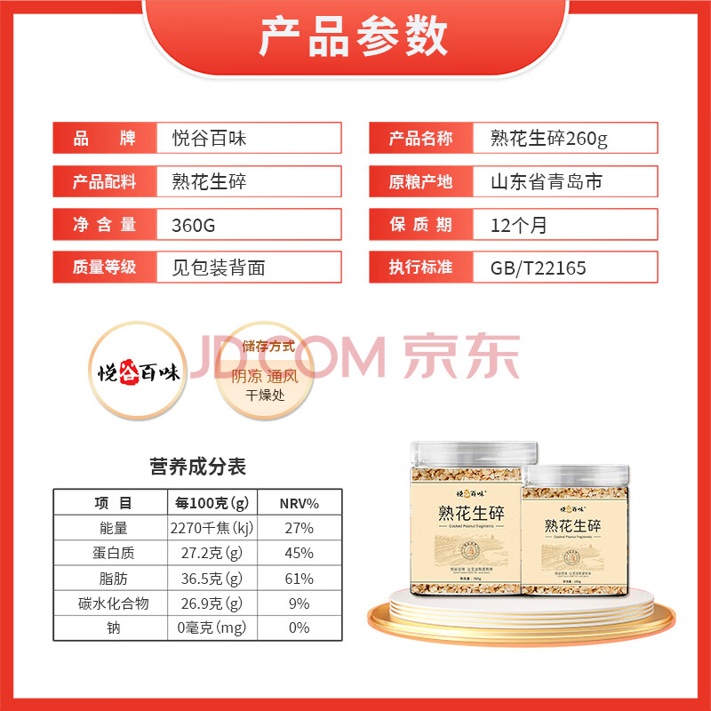 商品相册:悦谷百味 熟花生碎260g(香醇饱满 烘焙熟花生米 花生仁 烘焙火锅原料)第
